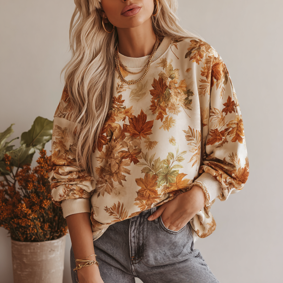 Bohemian Style Maple Leaf Pattern Printed Long-sleeve Sweatshirt