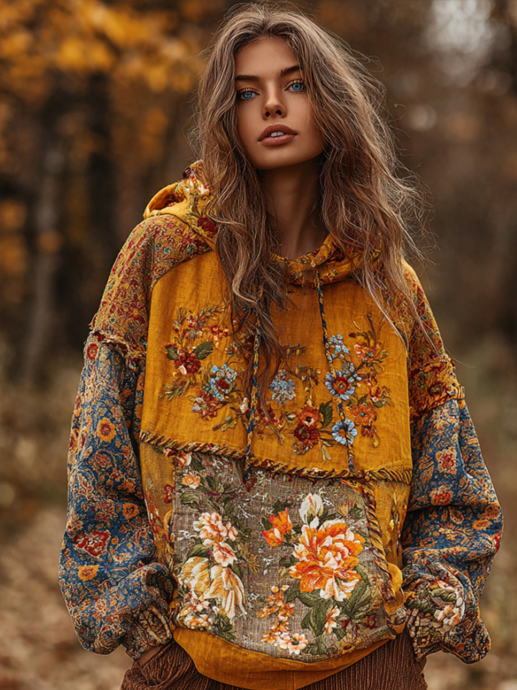 Bohemian Style Multi-color Patchwork Embroidery Flower Vintage Maple Leaf Yellow Hooded Long-sleeved Sweater