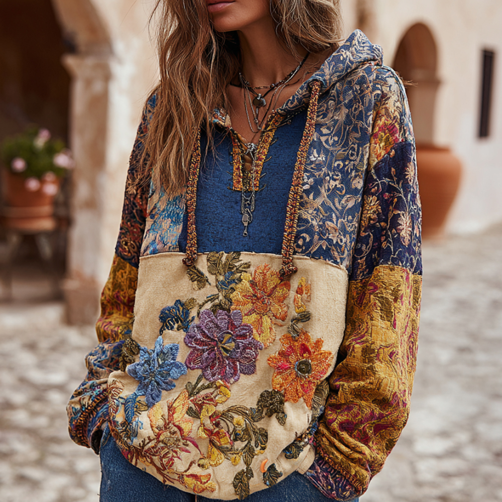 Bohemian Style Multi-colored Flower Embroidery Patchwork Vintage Hooded Long-sleeved Sweater