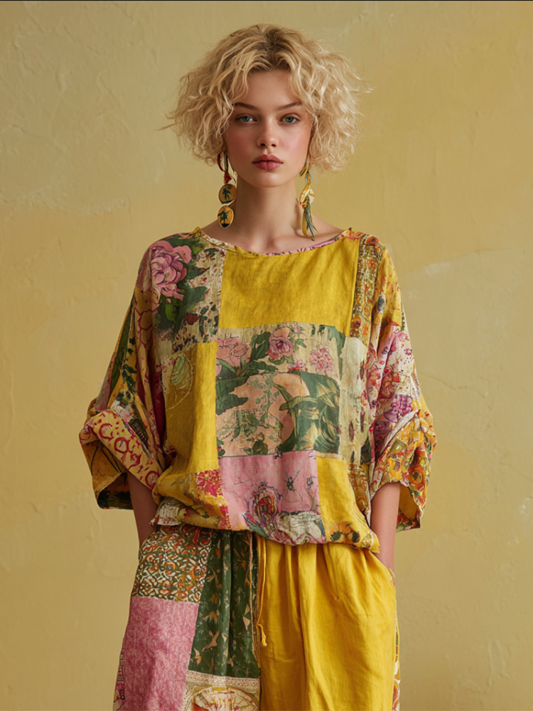 Bohemian Style Plant Flower Pattern Multi-color Women Cotton And Linen Top