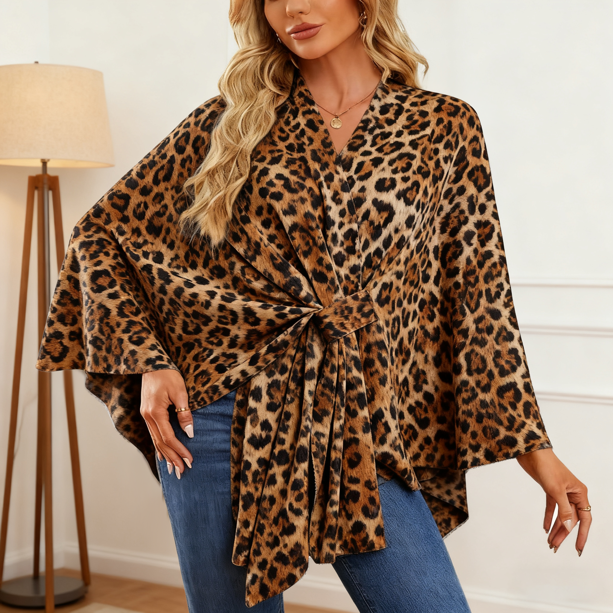 The loop is on the chest,cross-front design adds a touch of sophistication to the classic poncho silhouette.It drapes beautifully,creating a flattering and chic look that can easily transition from casual outings to more dressy occasions.
