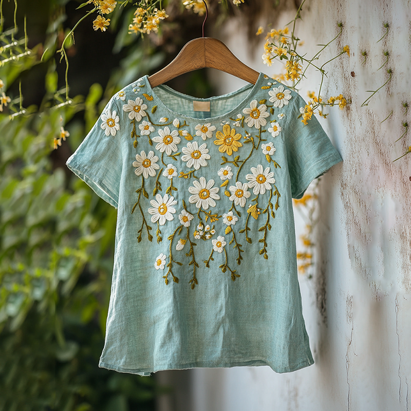 Floral Embroidered Round Neck Linen Blend T-shirt