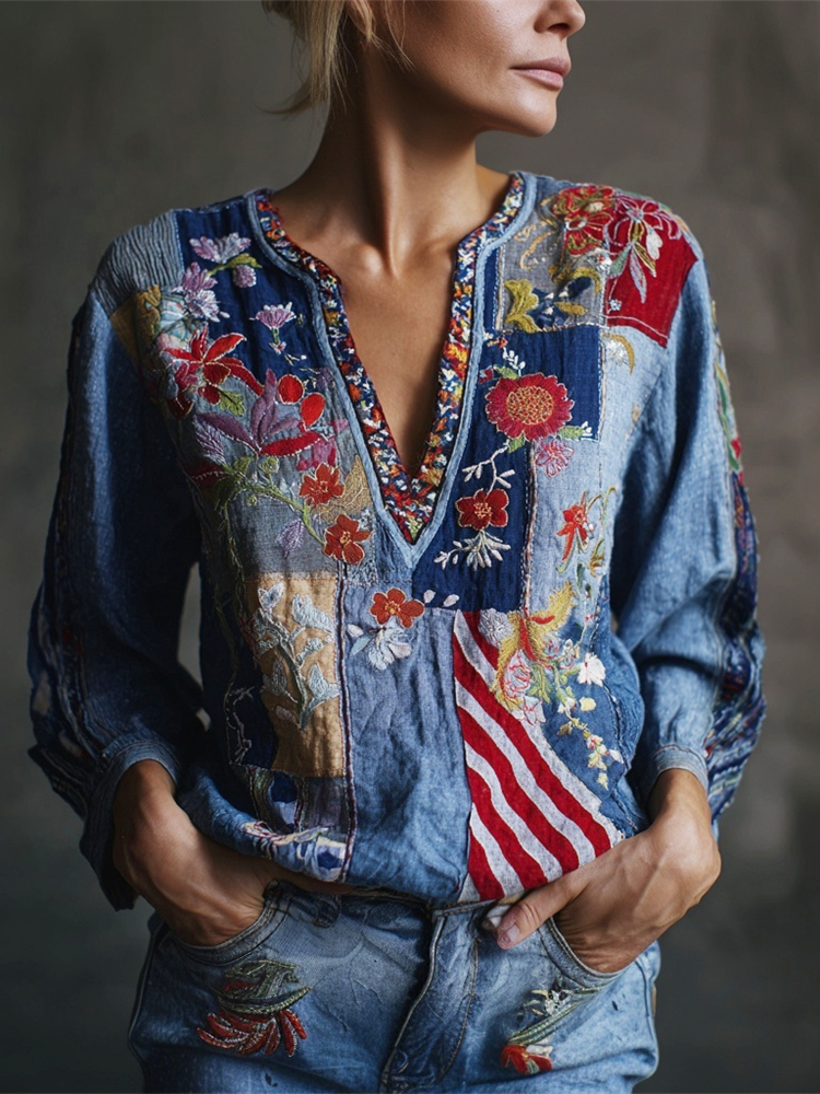 Independence Day Vintage Ethnic Floral Embroidery Women's Linen V-neck Shirt