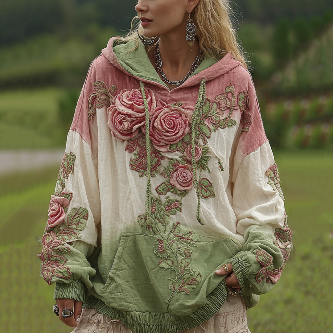 Love & Health Collection Classic Rose And Floral Art Linen Long Sleeve Hoodie