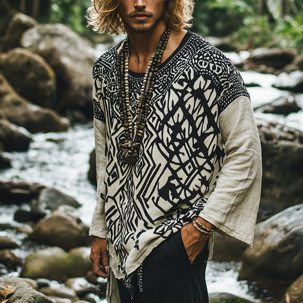 Men's Bohemian Holiday Style Vintage Printed Casual Long Sleeve Top