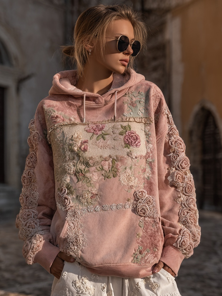 Pink Roses Embroidered Vintage Cozy Hoodie