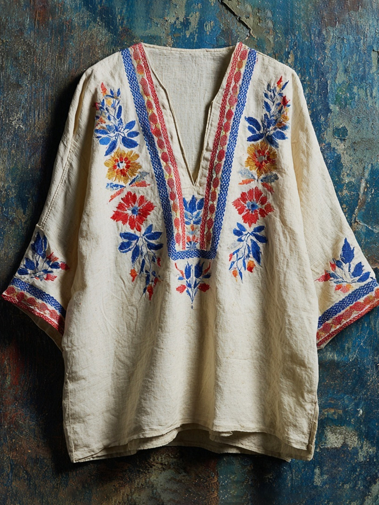 Vintage Boho Floral Embroidery Women's Linen V-neck Shirt