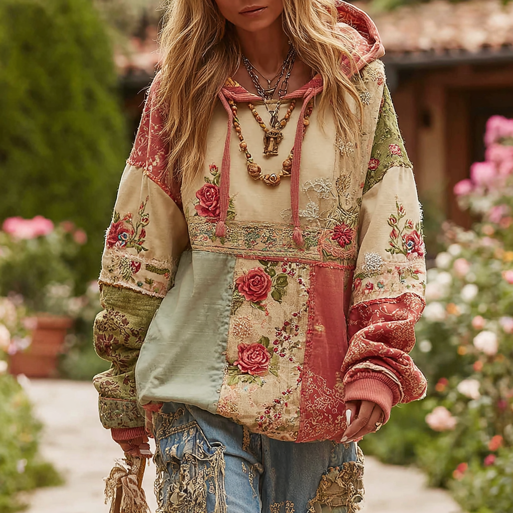 Vintage Floral Patchwork Art Linen Long Sleeve Hoodie