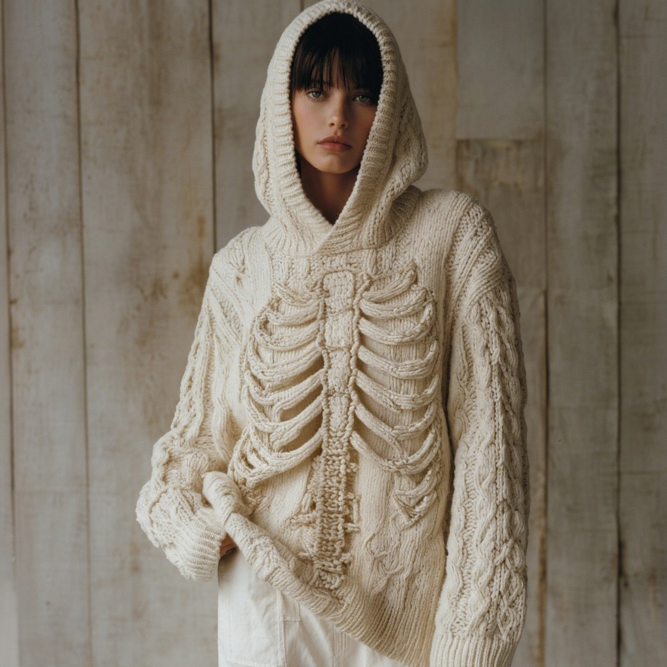 Vintage Halloween Skeleton Bones Art Chunky Knitted Hooded Sweater