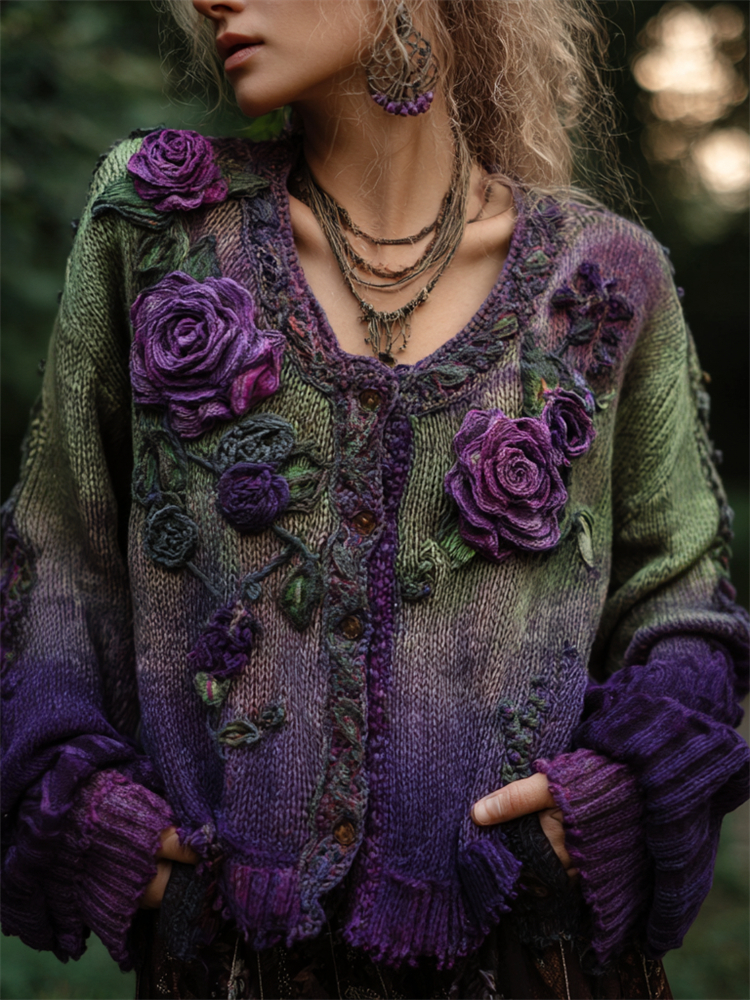 Vintage Purple Roses Crochet Gradient Cozy Cardigan