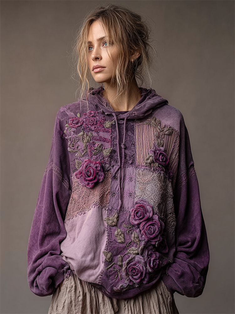 Vintage Purple Roses Fiber Art Floral Patchwork Hoodie