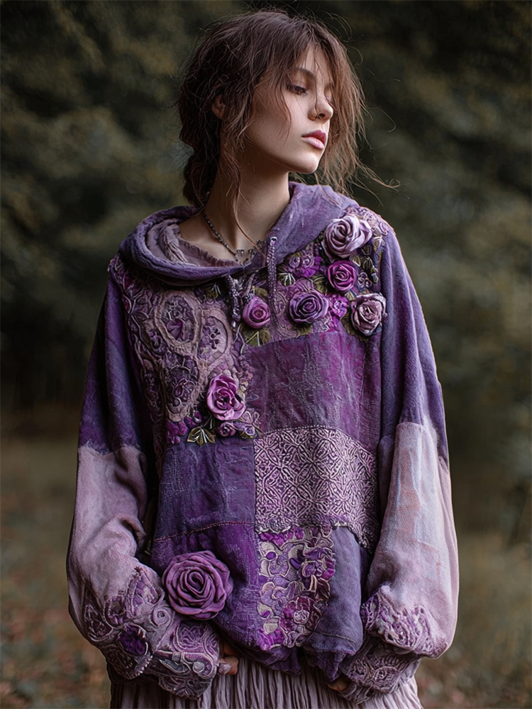 Vintage Purple Roses Fiber Art Lace Patchwork Hoodie