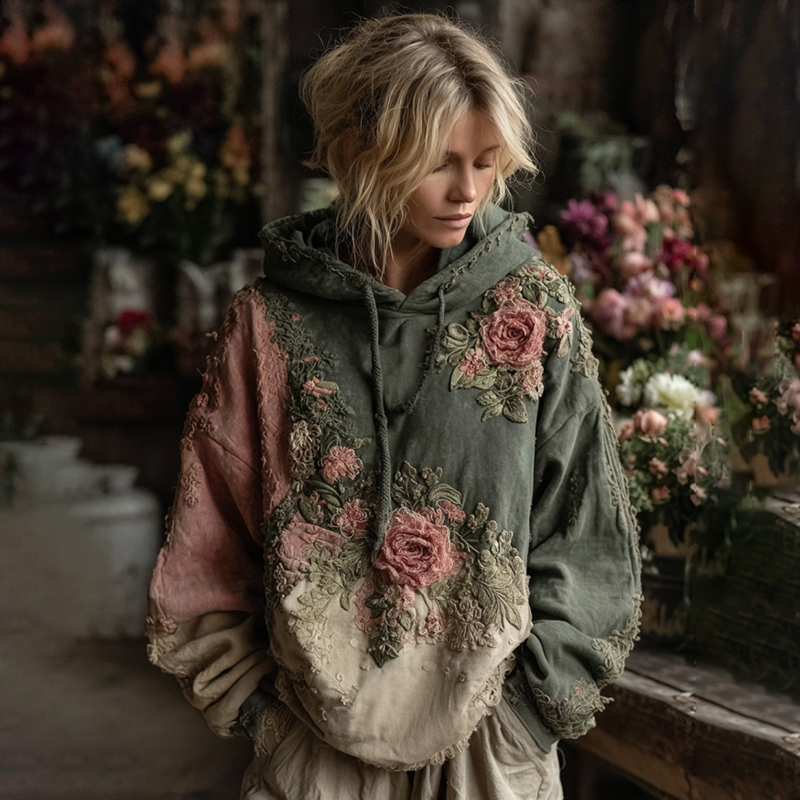 Vintage Retro Floral Patch Art Hooded Sweater