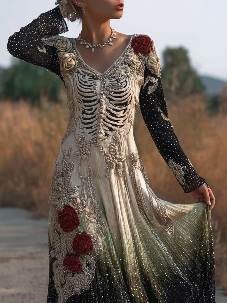 Vintage Skeleton Roses Glitter Gradient Flowy Maxi Dress