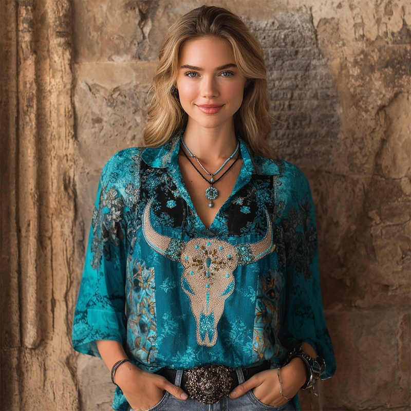 Western Bull Skull Embroidered Floral Turquoise Linen Tunic