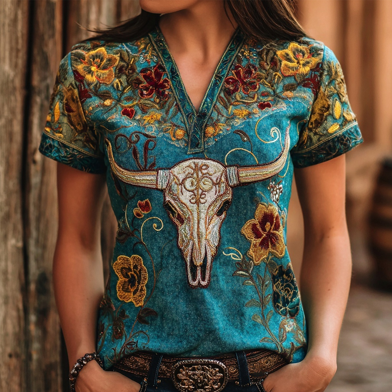 Western Bull Skull & Flowers Embroidered Vintage T Shirt