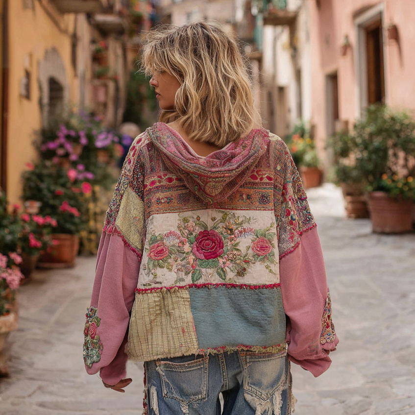 Women's Bohemian Floral And Ethnic Pattern Patchwork Cozy Warm Hoodie