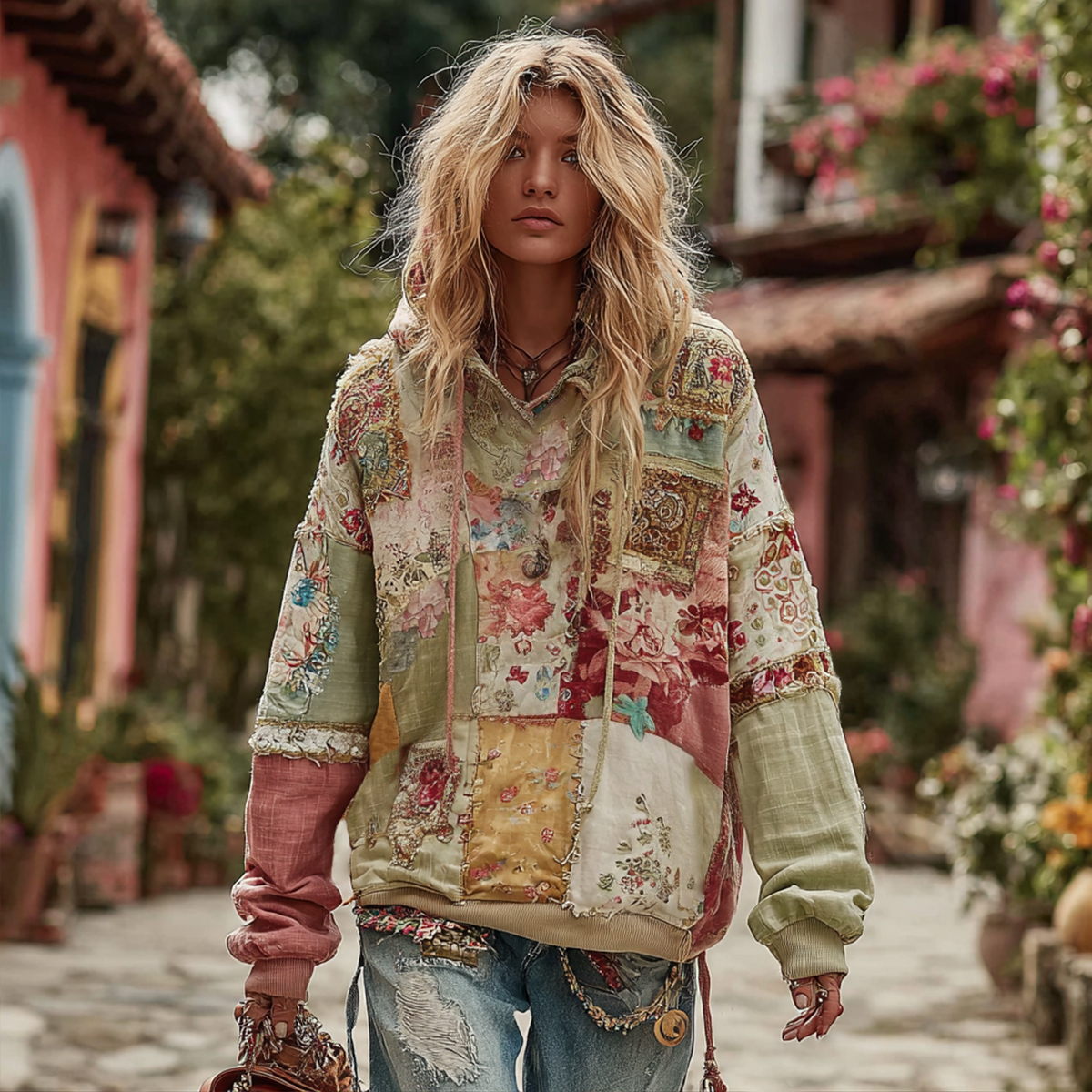 Women's Bohemian Floral Patchwork Cozy Hoodie