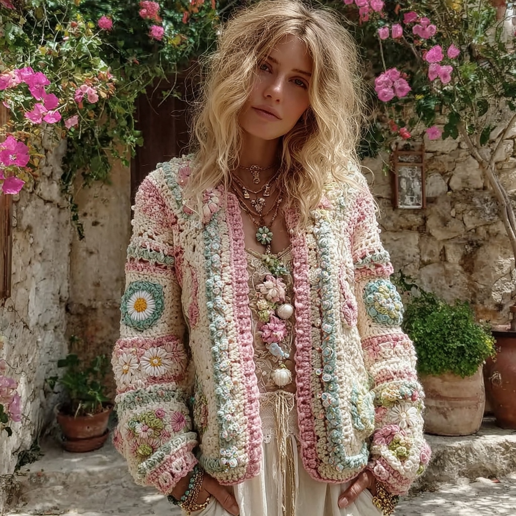 Women's Boho Colorblock Granny Check Chunky Knit Cardigan Sweater