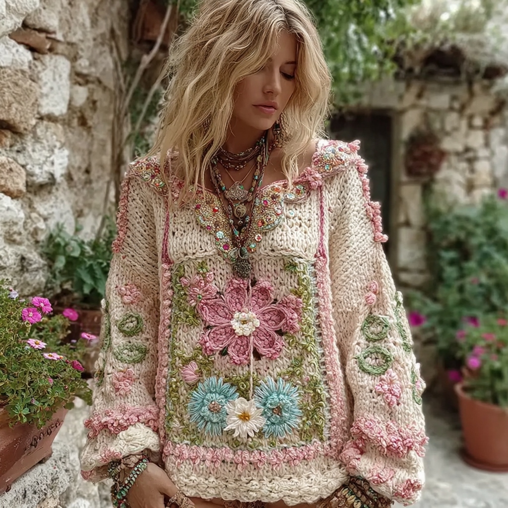 Women's Boho Floral Chunky Knit Small V-neck Sweater