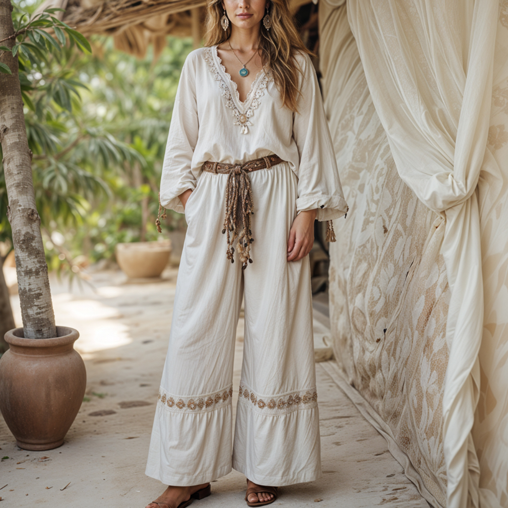 Women's Casual Cotton And Linen Retro Ethnic Style Loose Top Pants Set