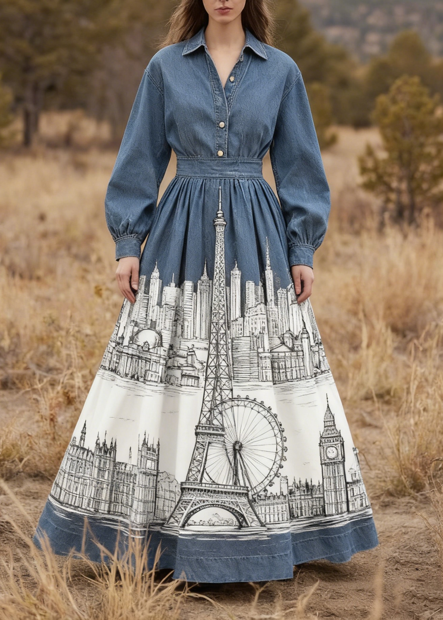 Women's Fashion Printed Denim shirt maxi dress