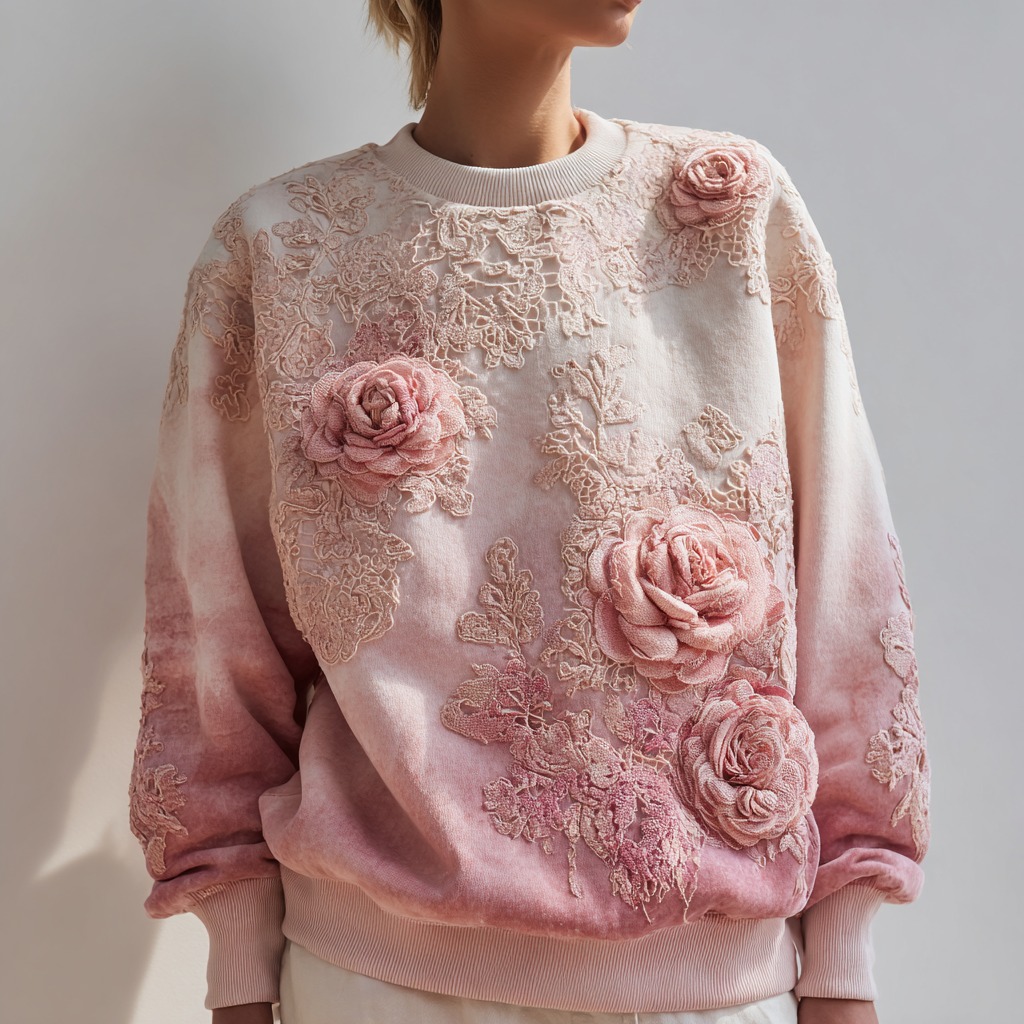 Women's Fashion Rose Embroidery Gradient Cotton Round Neck Sweatshirt
