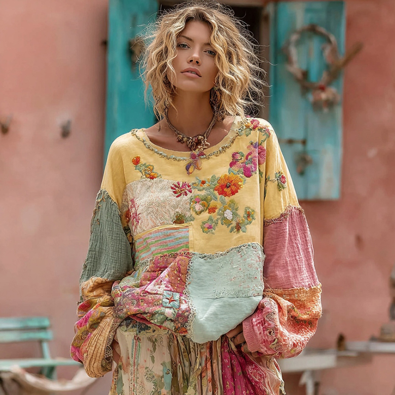 Women's Flower Embroidery Macaroon Color Patchwork Art Crew Neck Sweatshirt