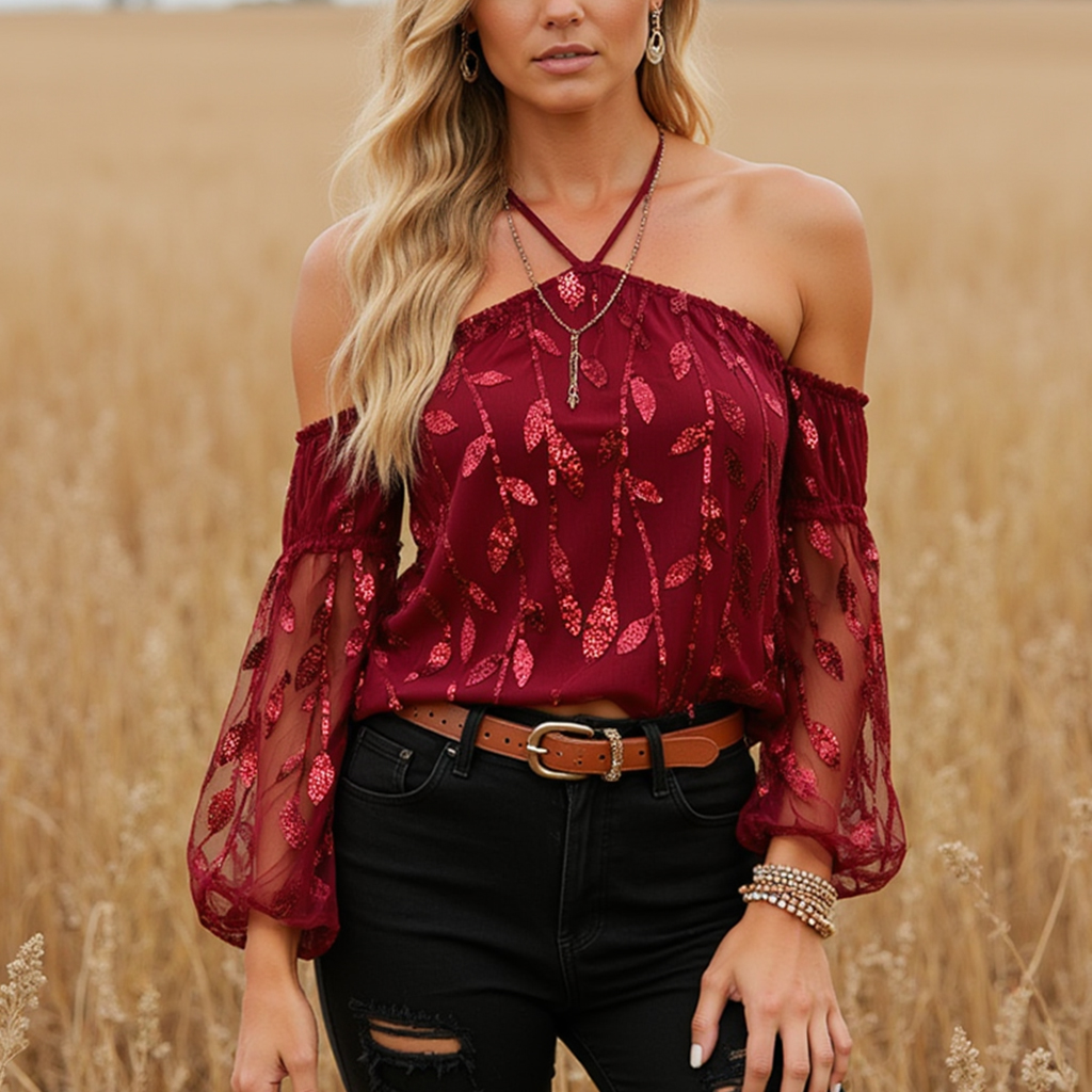 Women's Lace Mesh Embroidery Long Sleeves Top Shirt