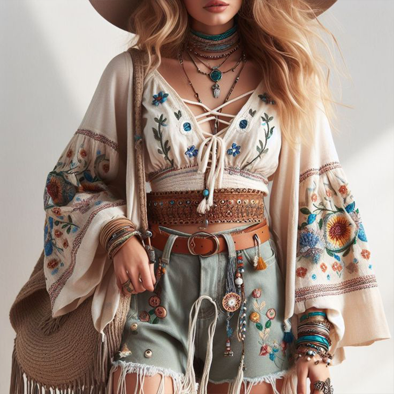 Women's Loose Shoulder Casual Bohemian Style Aztek Embroidery Outfit Fashion Tether Top Cardigan