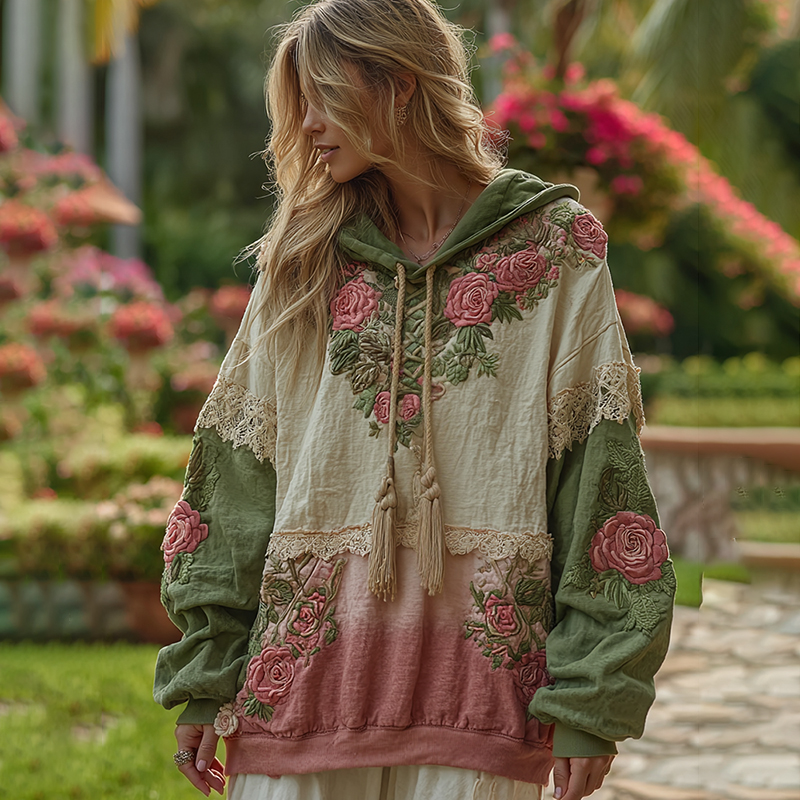 Women's Retro Floral Patch Art Comfortable Warm Hoodie