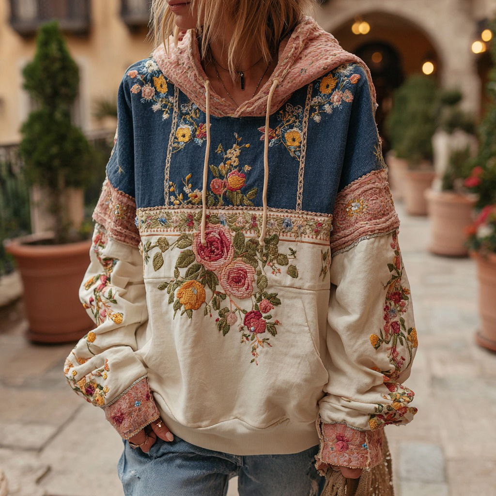Women's Retro Floral Stitching Contrast Color Warm Hoodie