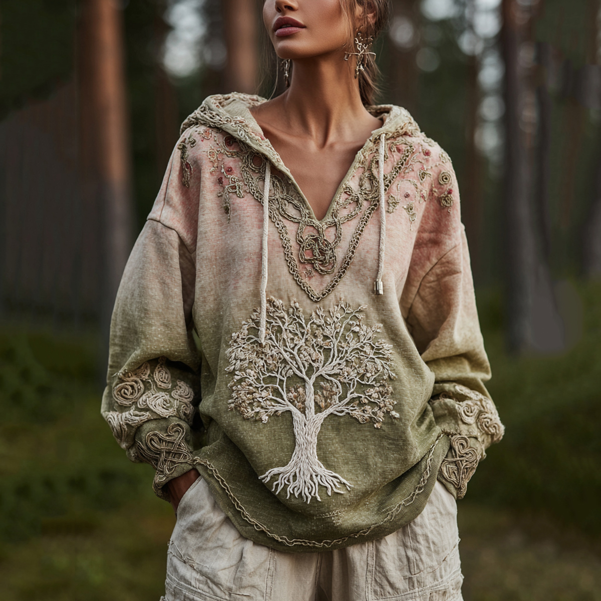 Women's Viking Tree Of Life Celtic Knot Art Gradient Cozy Warm V-neck Hoodie