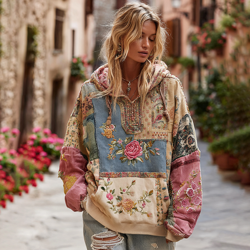 Women's Vintage Bohemian Floral And Rose Patchwork Cozy Warm Hoodie