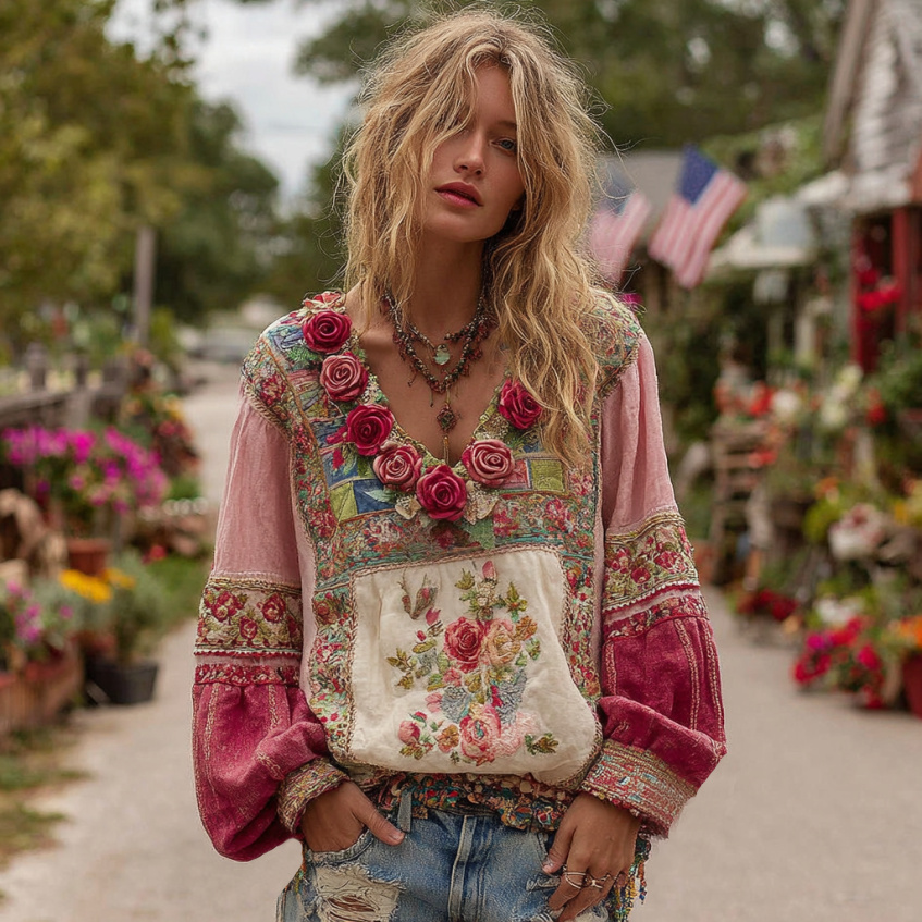 Women's Vintage Bohemian Floral And Rose Patchwork Linen V Neck Shirt