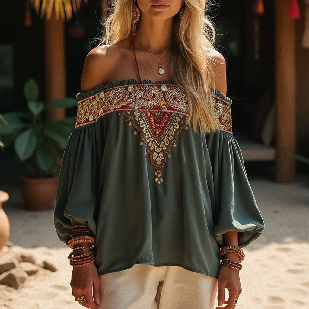Women's Vintage Embroidered Woven Long Sleeve Shirt