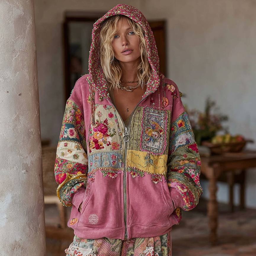 Women's Vintage Floral Embroidery Art Patchwork Zipper Hoodie