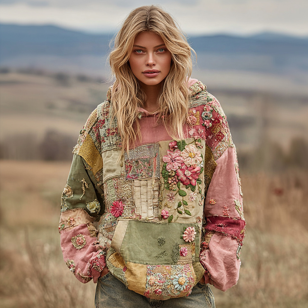 Women's Vintage Floral Embroidery Patchwork Art Casual Hoodie