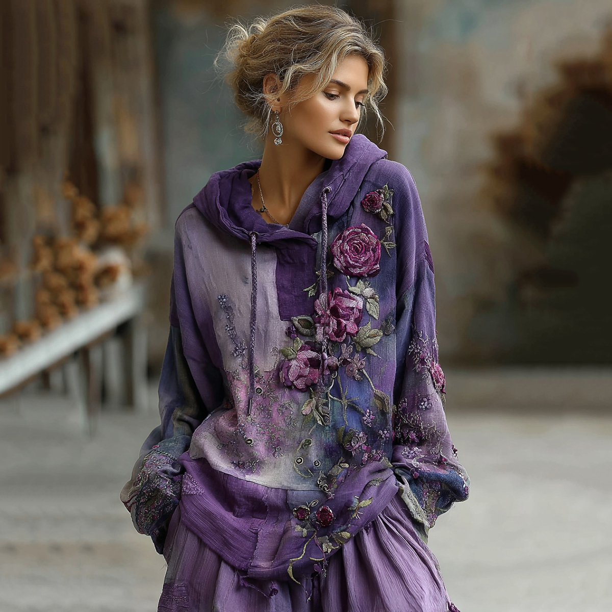 Women's Vintage Floral Patchwork Color Block Hoodie
