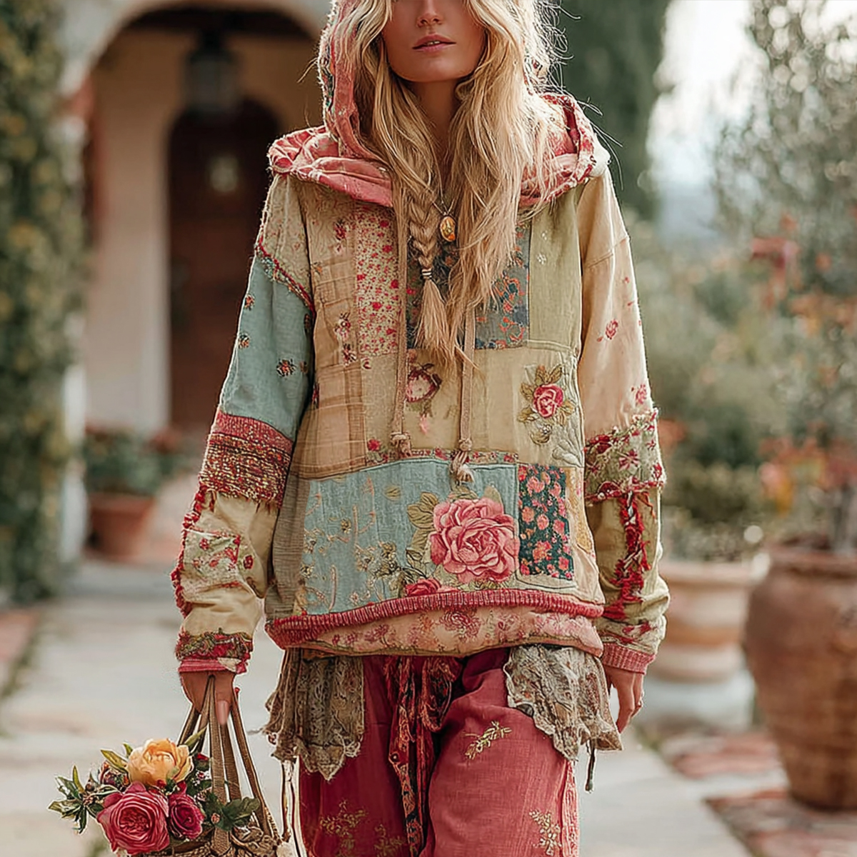 Women's Vintage Floral Patchwork Print Casual Hoodie