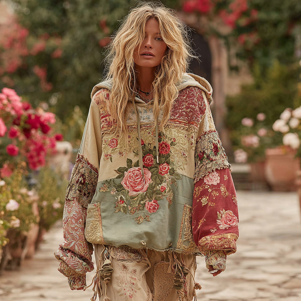 Women's Vintage Floral Patchwork Print Long Sleeve Hoodie