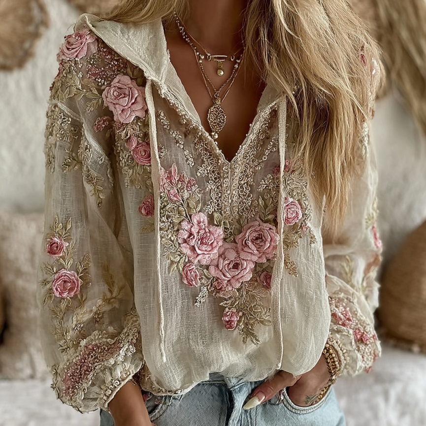 Women's Vintage Rose Floral Embroidery Warm V-neck Hoodie