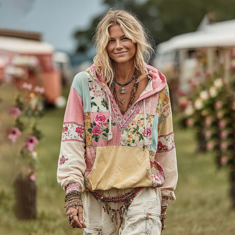Women's Vintage Rose Floral Patchwork Art Cozy Warm Hoodie