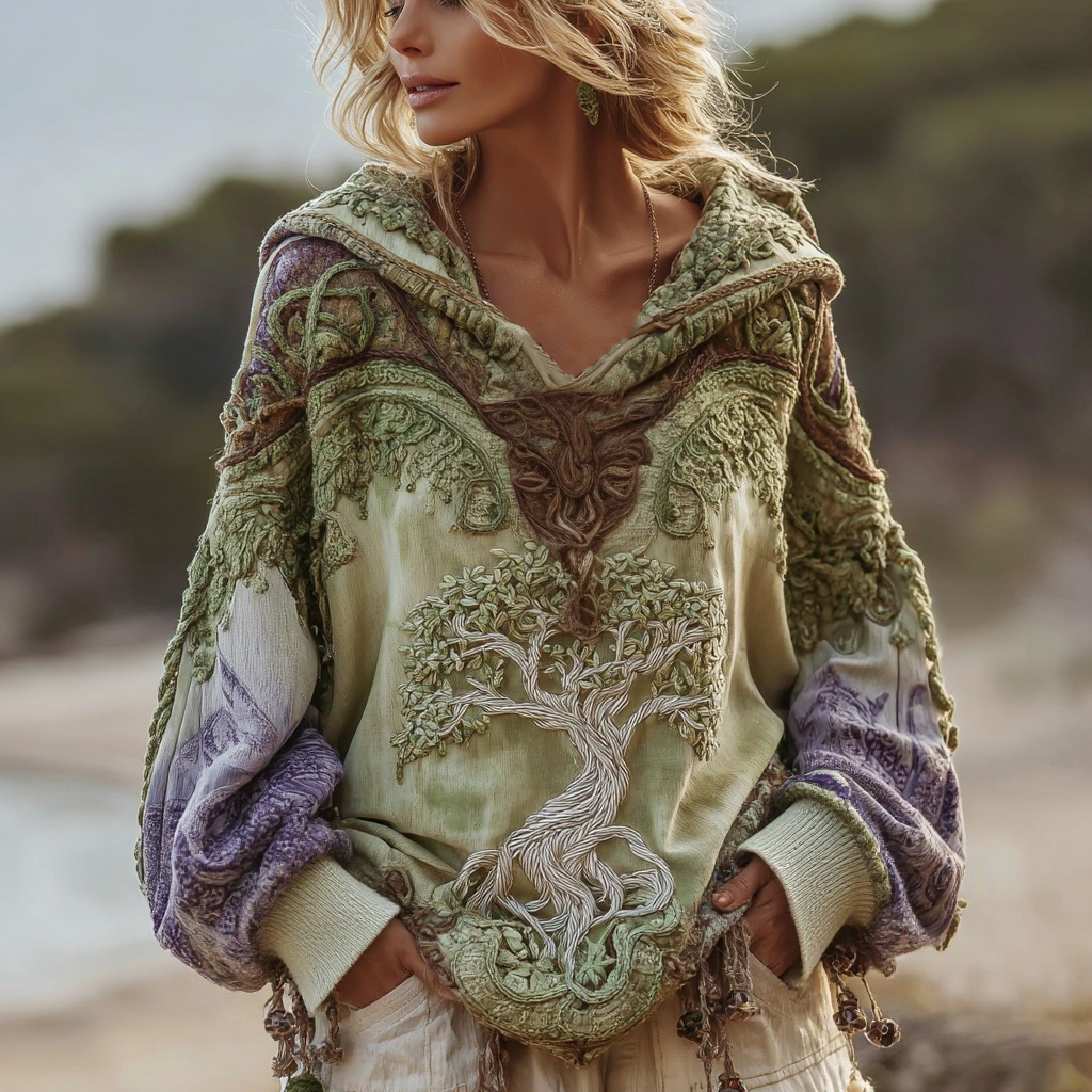 Women's Vintage Viking Tree Of Life Gradient V-neck Hoodie