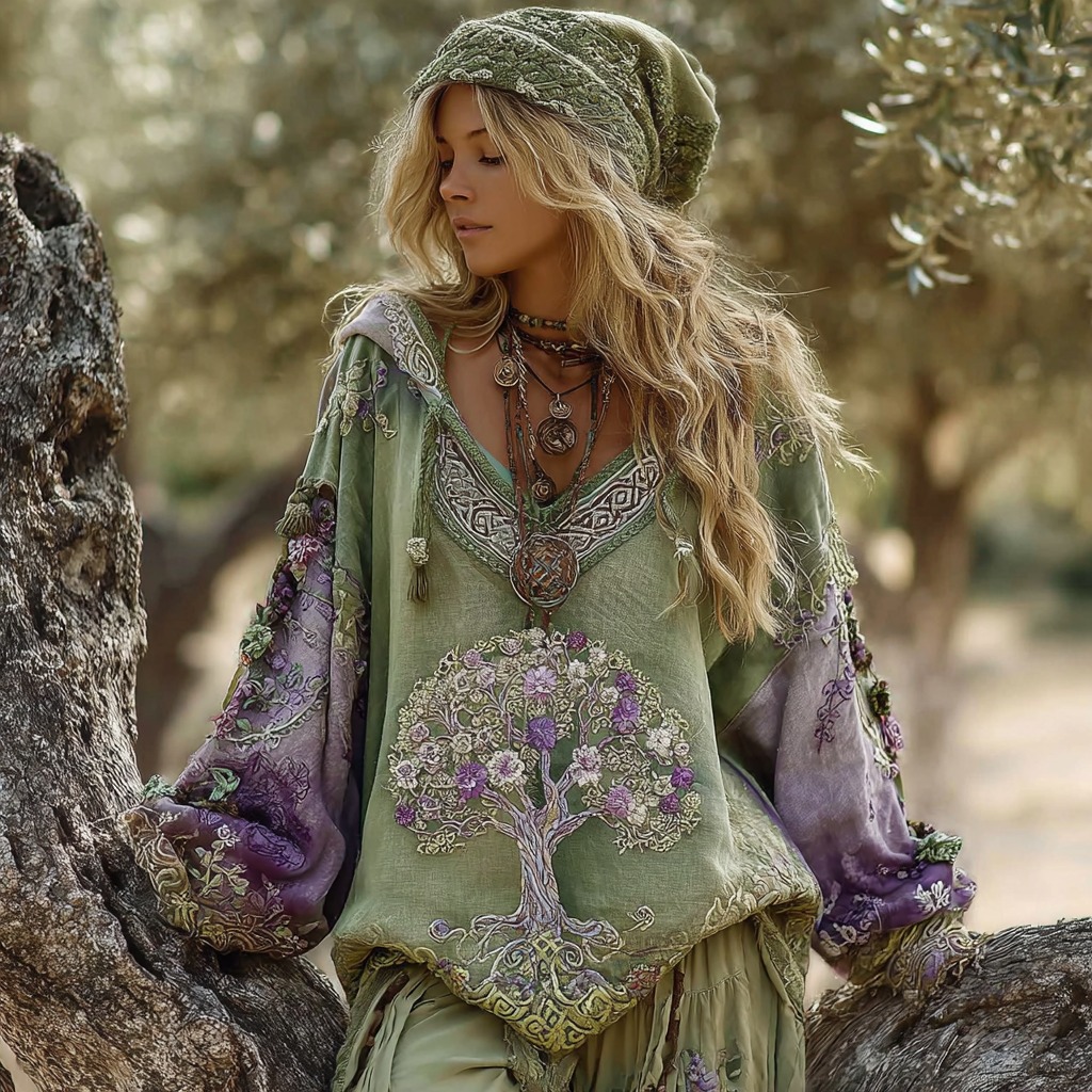 Women's Vintage Viking Tree Of Life Gradient V-neck Hoodie